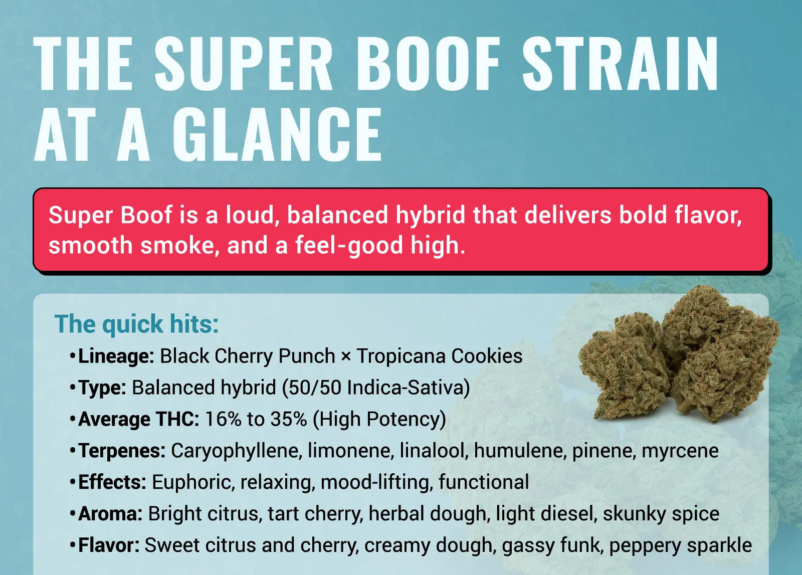 | Super Boof | Balanced hybrid (50/50) | 16% to 32% | Caryophyllene, Limonene, Linalool, Humulene | Citrus, cherry, doughy, funky gas | Loud citrus, sweet berry, earthy funk | Euphoric, giggly, relaxed, social, creative |