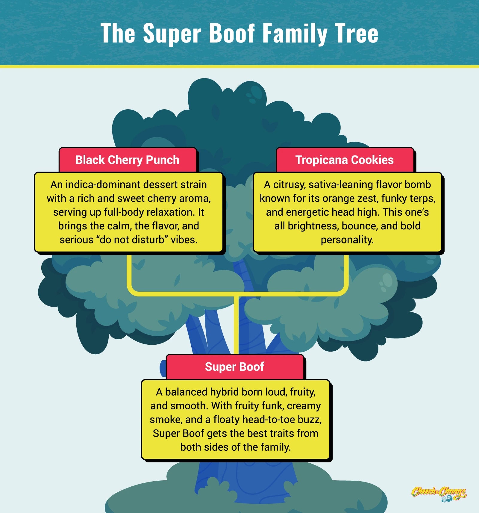 Super Boof owes its loud flavors and mellow effects to its parents — two powerhouse strains with serious personality. But before we get into genetics, let’s break down what that means. A cannabis strain is essentially a unique variety of the plant, bred for specific flavors, effects, and vibes. Super Boof is a true hybrid, meaning it blends both indica and sativa traits into one balanced experience: part heady uplift, part body melt.